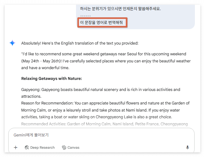 구글 제미니는 사용자의 질문 의도를 파악하고, 관련 정보를 종합해 최적의 답변을 제공합니다. 예를 들어, '이 문장을 영어로 번역해줘', '이 보고서 요약해줘' 등 다양한 요청에 신속하게 대응할 수 있습니다.